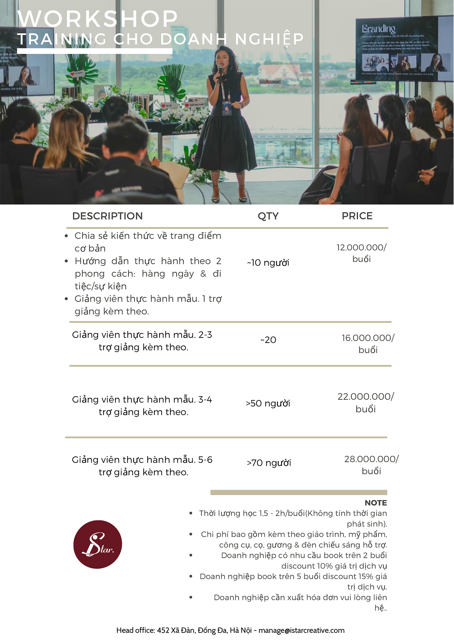 iStar Creative mang đến dịch vụ host workshop chuyên biệt cho doanh nghiệp, nơi kiến thức trang điểm và kỹ năng sáng tạo được truyền tải một cách bài bản, giúp nâng cao hình ảnh và tinh thần làm việc của đội ngũ nhân viên. Dưới sự dẫn dắt của chuyên gia Jane Nguyen – với hơn 14 năm kinh nghiệm trong lĩnh vực thẩm mỹ và đào tạo, chúng tôi thiết kế các buổi workshop linh hoạt, kết hợp lý thuyết và thực hành, mang lại giá trị thực tiễn cao. Dịch vụ này không chỉ nâng cao kỹ năng mà còn truyền cảm hứng tỉnh thức, giúp đội ngũ doanh nghiệp tự tin hơn trong giao tiếp và phong cách cá nhân.