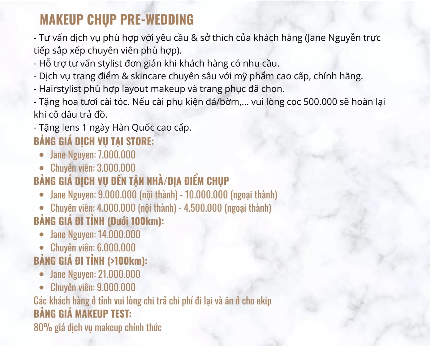 - Dịch Vụ Toàn Diện: Bao gồm makeup, hair styling, và hỗ trợ thử makeup trước để điều chỉnh hoàn hảo.
